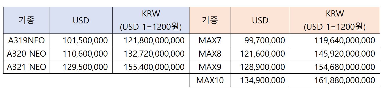 항공기 가격은 참 비싸다. 위의 표를 보게되면 대략 1대 가격이 8000만달러에서 4억달러 수준이다. 8000만달러를 한화로 환산하면(1200원기준) 약 953억원, 4억달러는 4766억정도 수준이다. 좀 더 상세�