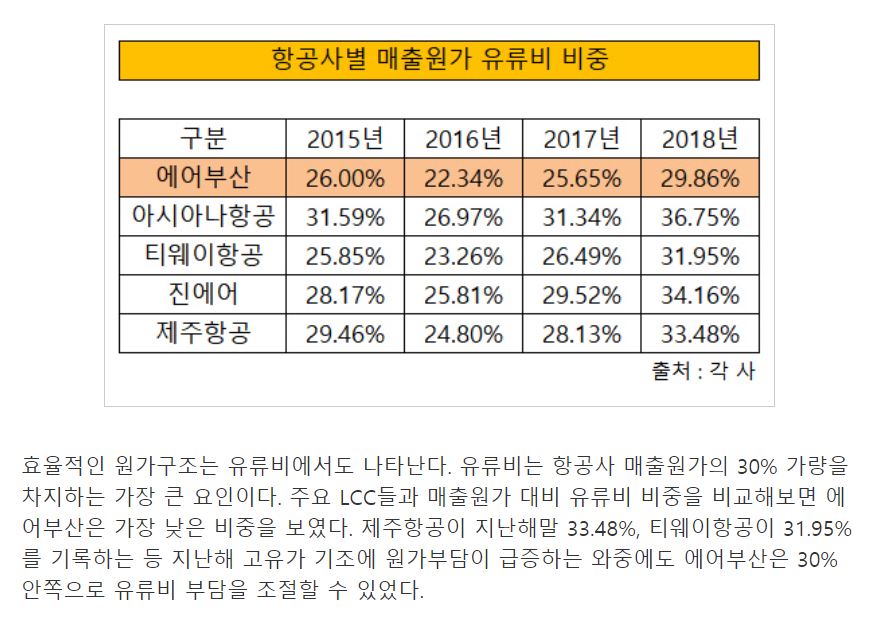 항공사에 돈이 나가는 영역 중 큰 비중을 차지하는 것이 인건비와 유류비다. 아래 뉴스 기사를 캡처한 이미지를 보면 국내 항공사들의 유류 매출 원가 비중은 평균 25~30% 수준이다. 1000억을 버는 항공사 중에 약 250~300억은 유류비라는 것이다.